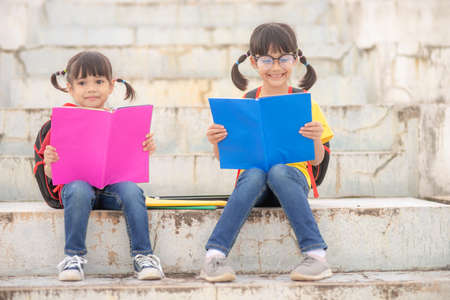Little Girl and sister reading a book together. Adorable Asian kids enjoying studying outdoors togther. Education, intelligence concept