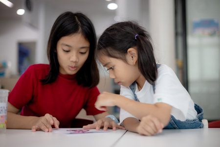Two young girls are sitting at a table, one of them is drawing while the other is looking at it. Scene is one of learning and creativity