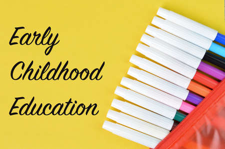 Top view of pen colors over yellow background written with EARLY CHILDHOOD EDUCATION