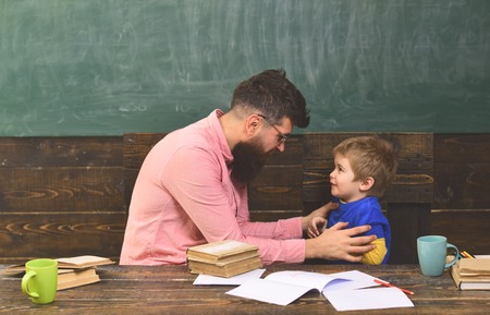 Male teacher explaining something to the boy. Side view bearded man in glasses and blond child in front of green board. Teacher holding naughty kid.