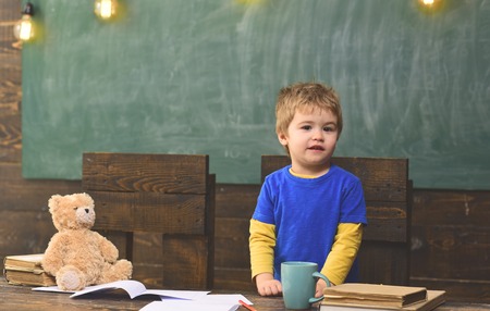 Little kid standing behind wooden desk. Dark wood table with copybooks, teddy bear, cup and pile of books. Individual education concept.