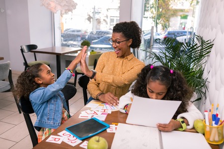 Cute girl. Cute little girl wearing denim jacket giving high five to her nursery teacher after studying time