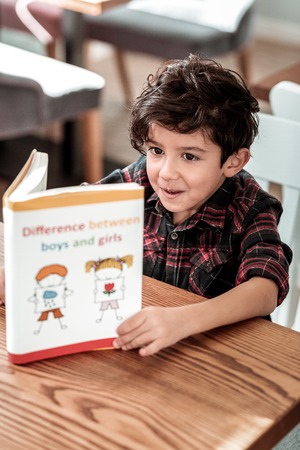 Excited boy. Cute curly dark-haired preschool boy feeling truly emotional and excited reading book