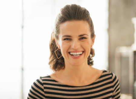 Portrait of smiling young woman in loft apartment