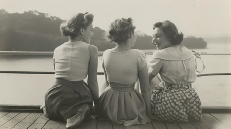 Three women sit on the edge of the deck legs dangling over the side as they chat and laugh unaware of the camera behind them. .