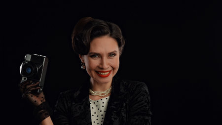 Woman actress in retro outfit with pin-up hairstyle and makeup posing at camera isolated on black background, woman smiling and posing with old film camera.