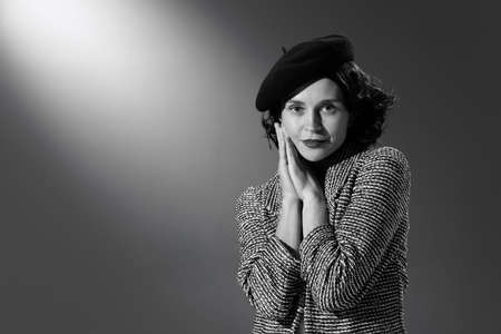 Portrait of beautiful woman in image of famous fashion designer posing in stylish classical clothes, jacket and hat. Black and white photography. Monochrome effect. Concept of fashion, style, history