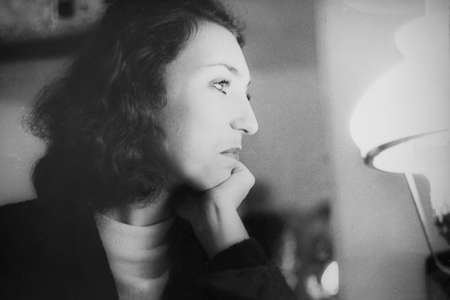 Vintage black and white portrait of a woman with a kerasin lamp, close-up. Early 1980s. Old surface, soft focus, outdated quality. Transferred property, family archive
