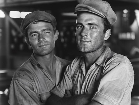Two factory workers posing for a portrait, wearing caps and work clothes, 1960s.