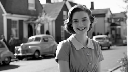 A woman smiling in front of a row of cars on the street, AI