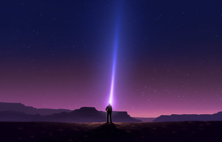 A lone person stands in a serene landscape, using a flashlight to illuminate the dark night sky filled with stars, showcasing the beauty and mystery of our universe.