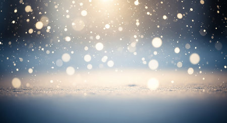 Soft, glowing bokeh lights fall like snow on a blurred, textured snowy surface Clear details and vibrant color...