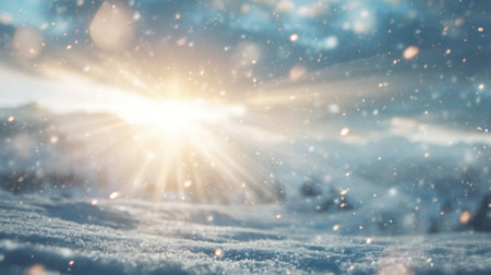 A snow-covered landscape with beams of sunlight creating sparkling reflections on the snow, evoking a sense of winter wonderland