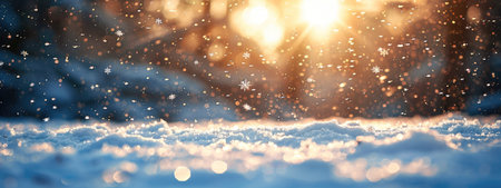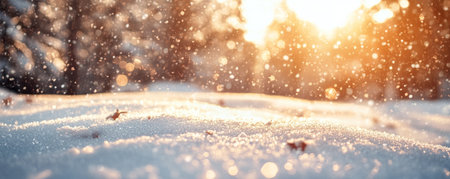 Golden hour light illuminates a snowy landscape. Sparkling snow and bokeh effects create a magical winter scene.