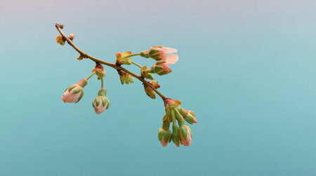 Delicate cherry blossom buds emerge on a branch, showing casing springs beauty in the soft morning light with a calming blue background.