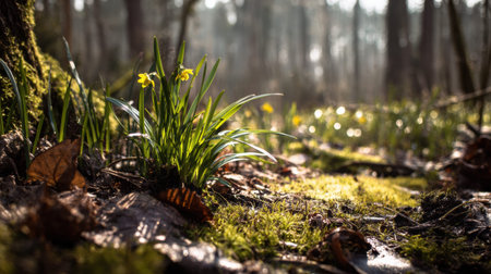Flowering plants emerge from the ground in a forest setting as cool light shines down on them during early spring.