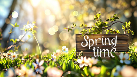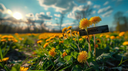 A vibrant scene of a meadow filled with golden dandelions during sunset, featuring a charming wooden sign labeled 'Spring'.