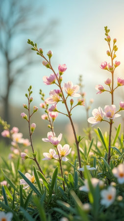 Close-up shot features delicate branches adorned with blooming flowers. The soft focus highlights pastel pink and yellow petals, contrasted by vibrant green leaves. The composition emphasizes natural beauty, with a blurred background creating a sense of depth. Suitable for visual content, it can be used for various projects.