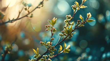 A branch with buds on it is shown in a blue sky. Concept of freshness and new beginnings, as the buds are just starting to bloom. The blue sky adds a calming and serene atmosphere to the scene