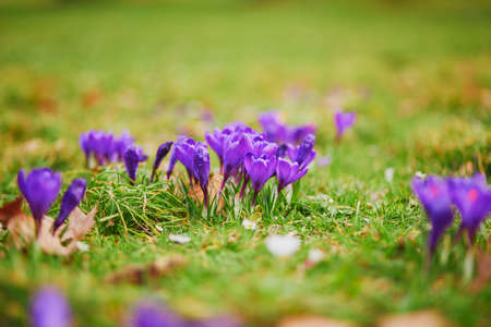 Beautiful purple crocuses in green grass on a spring day