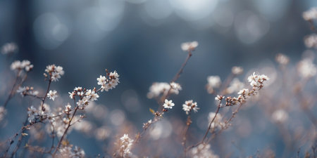 Spring flowers display delicate white petals and soft textures in an open area. The setting shows a clear change in seasons with small buds appearing.
