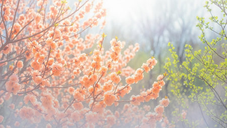 Soft focus view of delicate peach colored blossoms on tree branches with a hazy green foliage background and gentle...