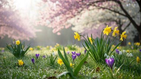 A sunlit spring meadow filled with yellow daffodils, purple crocuses, and dew-kissed green grass under blooming trees.