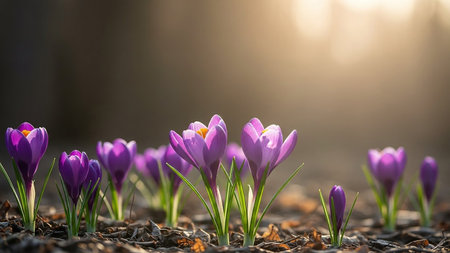 Beautiful purple crocus flowers in the sunlight. First spring flowers.