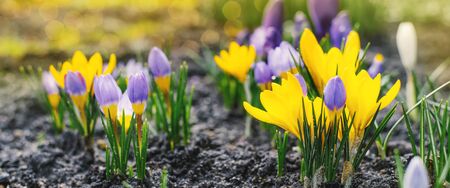 Spring bright background with blooming purple, lilac, yellow Crocus flowers in early spring. Crocus Iridaceae (iris family), banner image with sun glare
