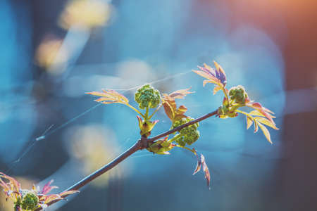Young spring leaves of bird cherry tree with unblown flower buds. Spring background. Sunset twilight. Soft selective focus. copy space