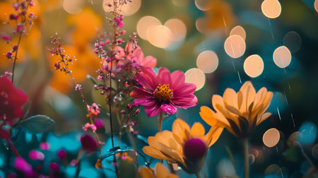 Vibrant image of colorful flowers blooming in a garden, with soft bokeh lights in the background, creating a dreamy and serene atmosphere representing the beauty of nature and tranquility.