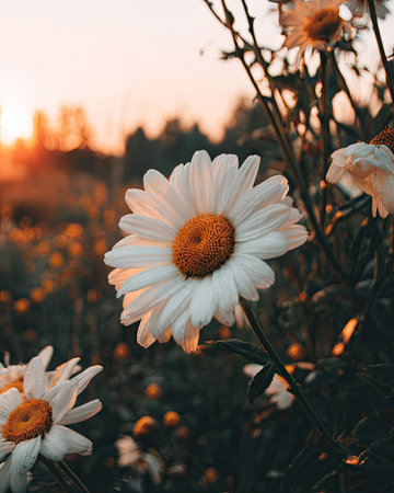This image showcases several daisy flowers in full bloom. The primary focus is on the large, white petals with a yellow center. The composition is bathed in soft, natural sunlight, enhancing the warm tones of the scene. Suitable for a variety of projects, this image could be utilized for editorial or commercial purposes.