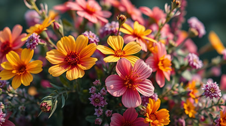 Vibrant bouquet of autumn flowers bathed in warm sunlight outdoors close up