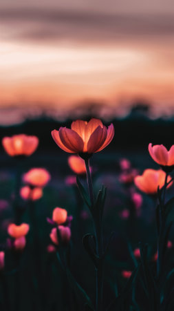 A field of pink flowers with a sunset in the background, AI