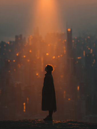 Ethereal and dramatic portrait of a lone figure in silhouette standing high above a sprawling, misty metropolis, looking up into a bright shaft of golden sunlight or heavenly light piercing the atmosphere at sunrise or sunset.
