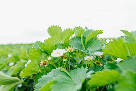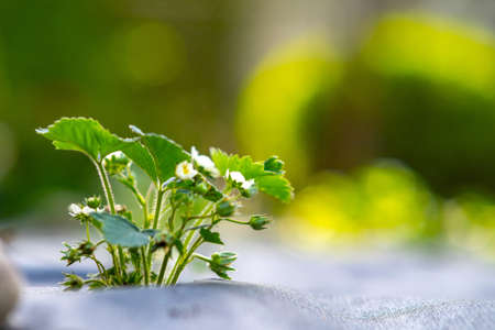Closeup of small green strawberry plants with white flowers growing outdoors in summer garden.