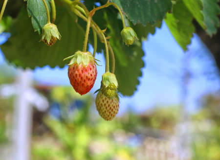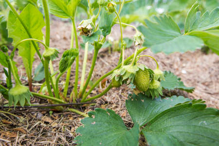 Unripe strawberries hanging on a bush in the garden