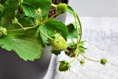Ripe and unripe strawberries in a flower pot