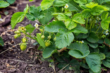 Green strawberries among the foliage on the garden bed. Summer harvest. close-up shooting.
