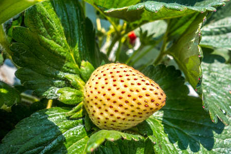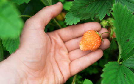 Man holding young unripe orange strawberry.