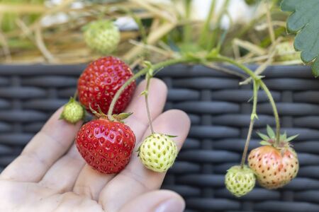 Young planting strawberry and its flower in summer with vintage filter applied