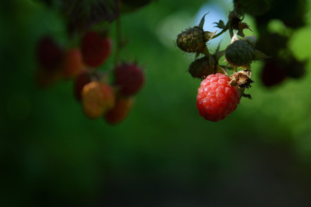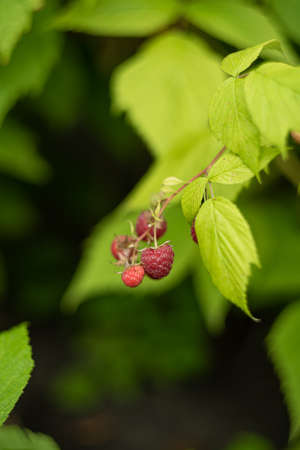 Beautiful bunch of fresh ripe red raspberries growing outdoors in organic garden. Selective focus. Ready to eat raw vegetarian and vegan food. Atmospheric background with berry details and copy space.
