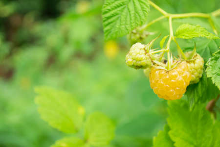Yellow raspberry on a green bush. Yellow raspberries have ripened. The first harvest of raspberries. Yellow raspberries on a bush in the garden. Yellow raspberries on a green background.