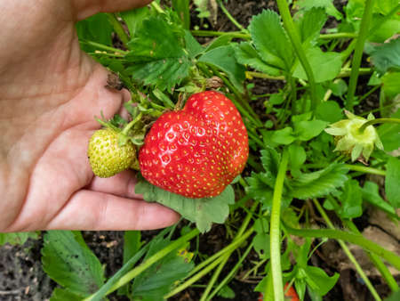 View of a hands palm holding huge, red, ripe strawberry in the garden with strawberry plants in the background