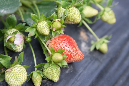 The strawberry berries in the garden in the countryside of Thailand.