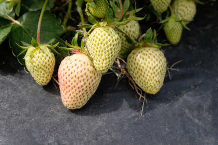 Close-up shot of green unripe strawberries in a greenhouse on ground background.