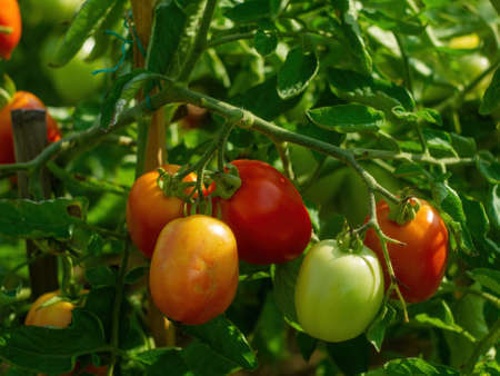 branch of red tomatoes with ripe and unripe vegetables, growing tomato in a greenhouse, closeup