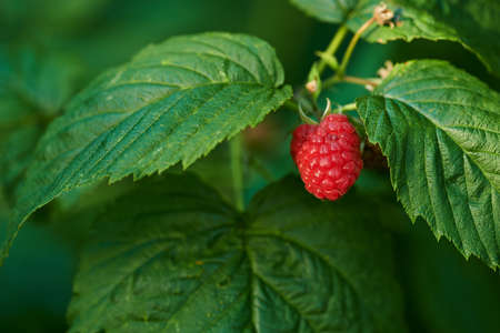 One raspberry growing in a garden with green vibrant leafs in an organic filed during spring. Closeup of fresh, red and healthy natural produce ripening in a bush. Beautiful fruit plant in summer