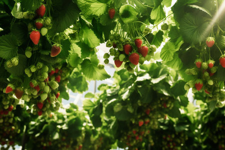 Strawberries on Vine in Summer Greenhouse: Play of Light and Shade