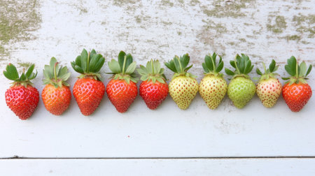 A captivating arrangement of strawberries in different ripeness stages on a rustic wooden surface, showcasing vibrant colors and textures ideal for food photography and culinary projects.